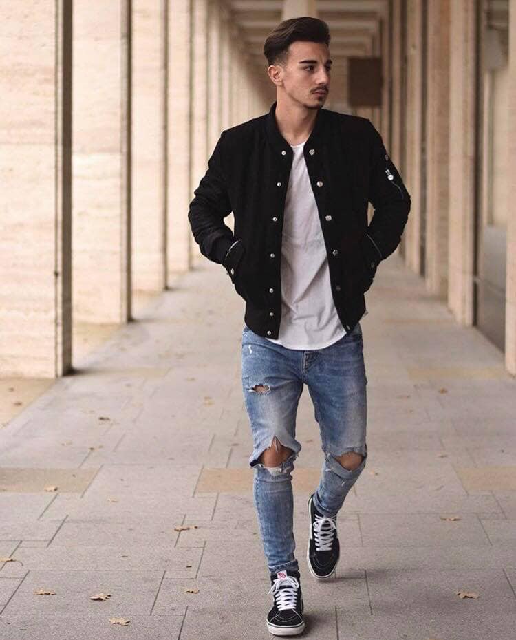 Jean đen rách gối mix cùng áo long tee cực chất và năng động