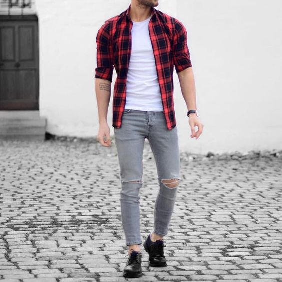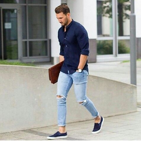 1 Trong những fom áo khá dễ mặc cho các bạn nam với dáng áo đứng giúp các bạn thêm manh mẽ và lịch thiệp. Phá cách khi mix cùng chiếc skiny rách gối và điểm cộng nếu xắn nhẹ gấu quần khi kết hợp với mẫu giày lười.